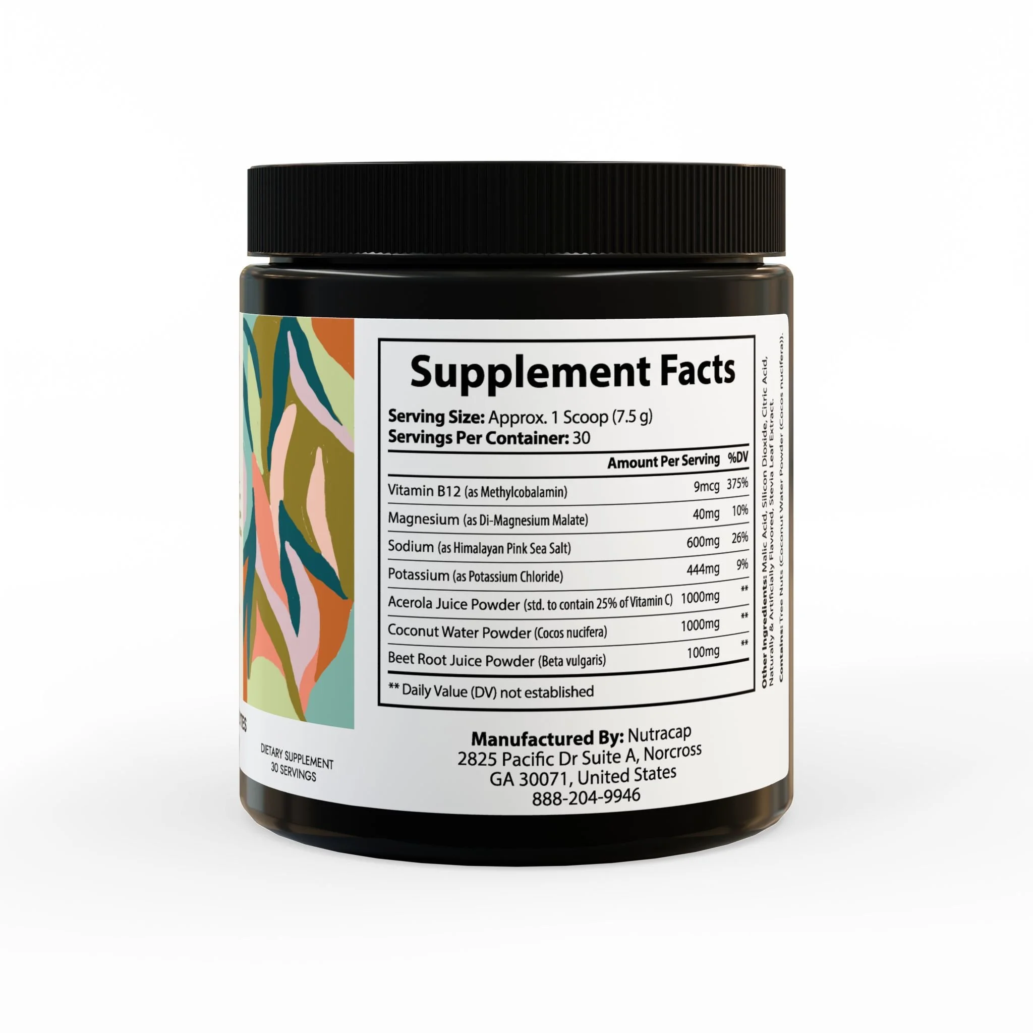 Ingredients: Vitamin B12 (as Methylcobalamin), Magnesium (as Di-Magnesium Malate), Sodium (as Himalayan Pink Sea Salt), Potassium (as Potassium Chloride), Acerola Juice Powder (std. to contain 25% of Vitamin C), Coconut Water Powder (Cocos nucifera), Beet Root Juice Powder (Beta vulgaris). Other Ingredients: Malic Acid, Silicon Dioxide, Citric Acid, Naturally & Artificially Flavored, Stevia Leaf Extract. Contains: Tree Nuts (Coconut Water Powder (Cocos nucifera)